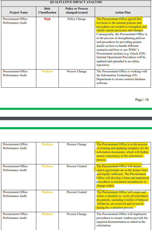 Poking around the WSSC website, I found this interesting annual report issued by the Office of the Inspector General (OIG), which has audit staff imbedded at WSSC. A review of last year’s (September, 2022) OIG Annual Report shows that some pretty major gaps and / or control weaknesses appear to exist in WSSC’s Procurement Office and in their processes. Here is a screen shot from pages 16-17: