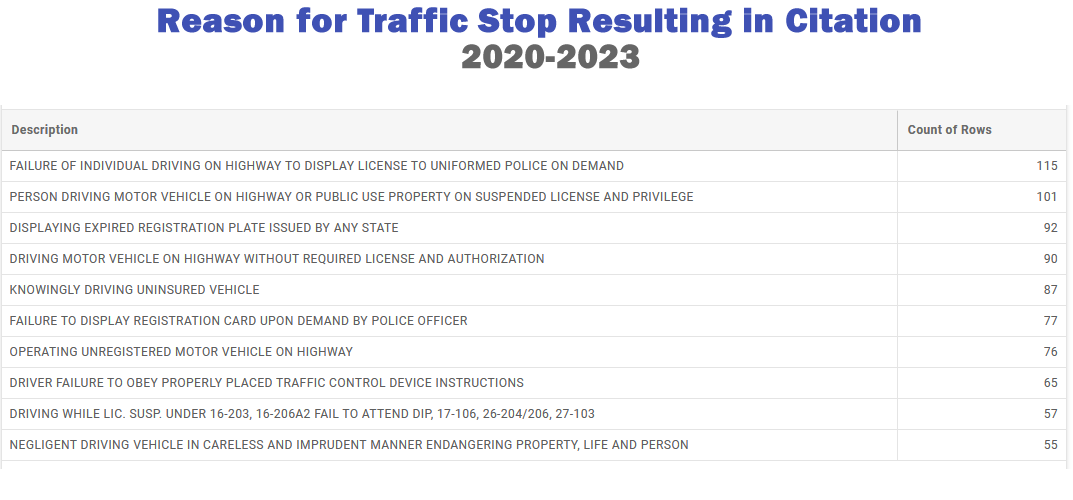 These numbers are difficult to understand without some additional context. But you can see that driving without tags is not leading to the arrest of individuals.