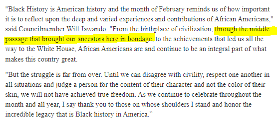 His mother is a “white Kansan” and his father, Olayinka Jawando, came to America voluntarily from Nigeria as an immigrant, fleeing civil war back home. If there are additional details as to CM Jawando’s ancestry and the middle passage slave route, he should share them. Otherwise he should be accurate and stop saying “brought our ancestors here in bondage”. That simply isn’t true based on the facts made public today. Maybe he is referring to something else with the word “our” but the common definition of the word “our” is ‘belonging to or associated with the speaker and one or more other people previously mentioned’.