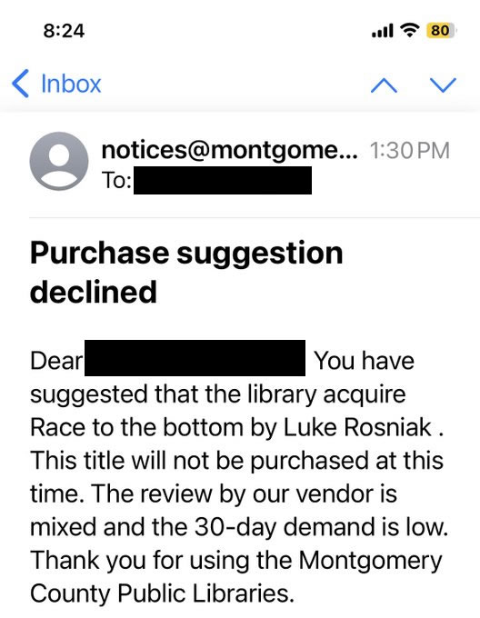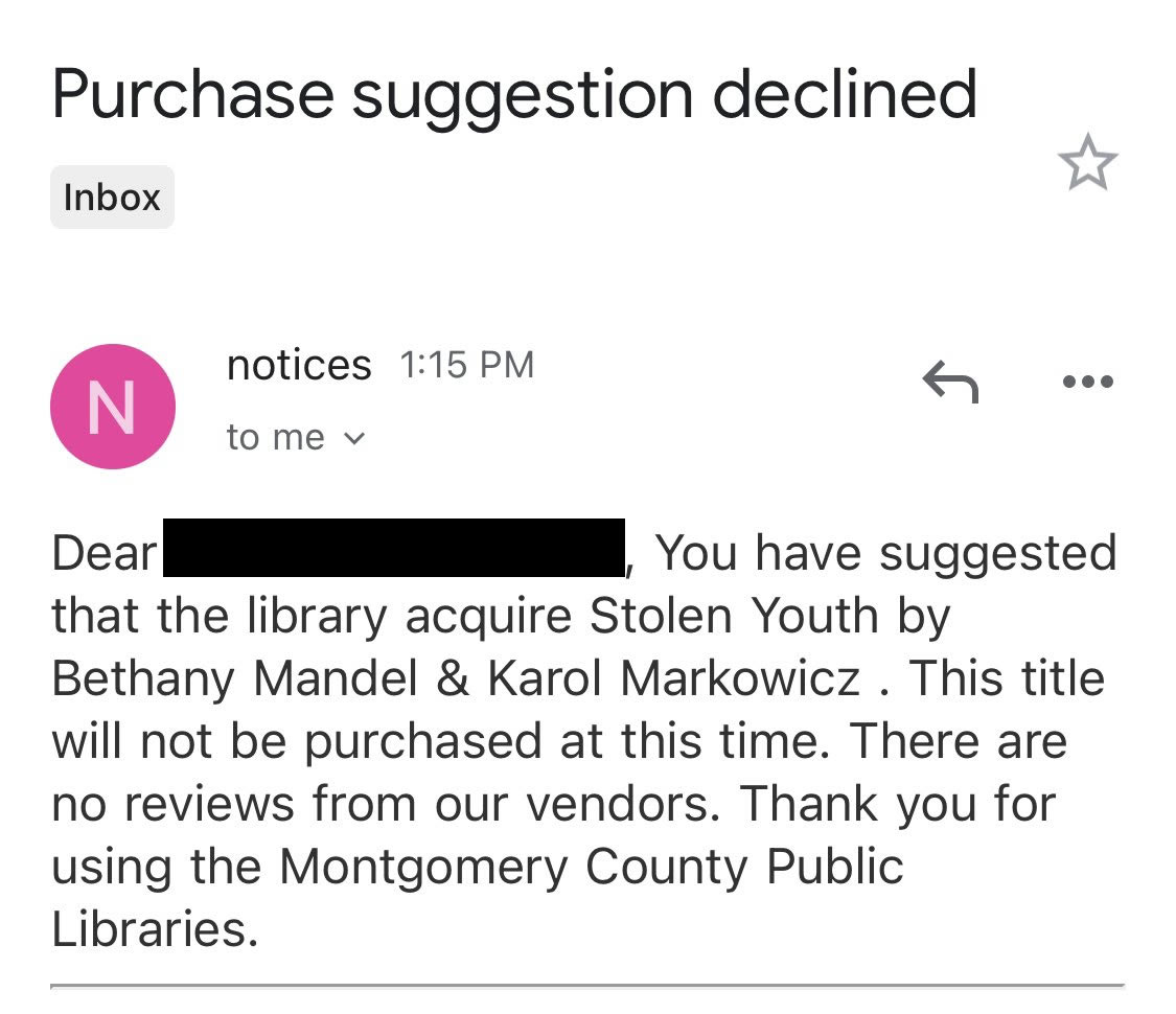Several readers of CleanSlateMoCo have provided screen shots of responses they received from the Montgomery County Public Library system after requesting the book be added to the collection.
