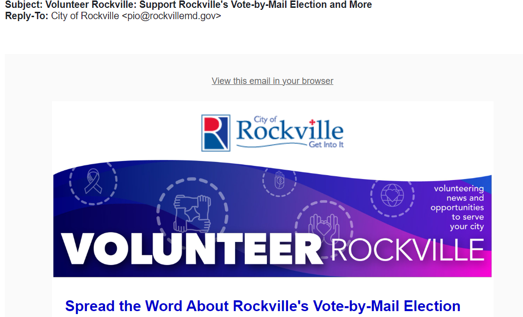 The City of Rockville’s official public information office sent out an e-mail recently highlighting “Volunteer Rockville” and posting talking points about the upcoming city-wide election that has ballot questions, one of which, if passed, may give non-citizens the ability to vote in city elections in the future. You can see a screen shot here of the intro, and the public link to the full newsletter is here.