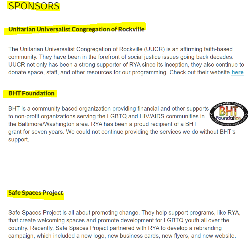 But, it turns out to be an “Alliance” of one. On its website, Rainbow Youth Alliance claims the following as sponsors (screen grab below is from June, 2023):