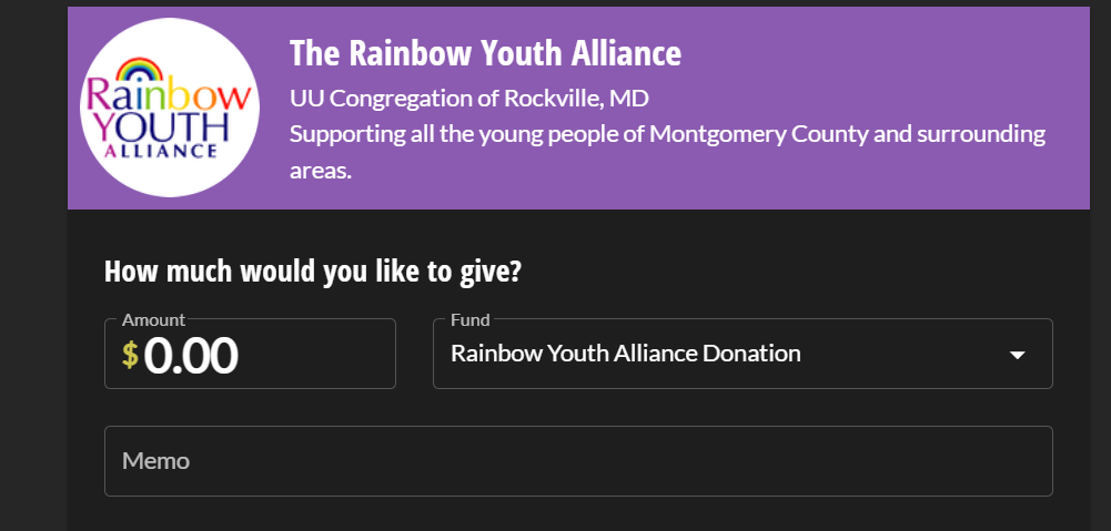 So the Rainbow Youth Alliance is really an “Alliance” of one organization. And that organization is the Unitarian Universalist Congregation of Rockville. This is also proven when one goes clicks on the “Donate Now” icon on the Rainbow Youth Alliance home page. Here is a screen cap taken June, 2023: