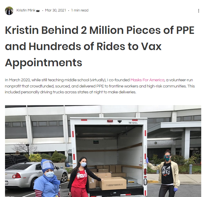 In March 2020, CM Mink wrote on her blog that she “while still teaching middle school (virtually), I co-founded Masks For America, a volunteer-run nonprofit that crowdfunded, sourced, and delivered PPE to frontline workers and high-risk communities. This included personally driving trucks across states at night to make deliveries.”