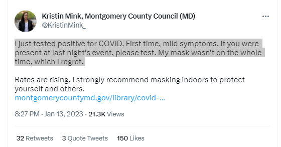 Anyways, while the mask craze was certainly not unique to Kristin Mink or Montgomery County politicians, she seems to still be stuck on indoor masking as some kind of prevention mechanism (see twitter capture below). But in 2023, and indeed before, there is/was ample evidence that it isn’t effective at preventing transmission. There is nothing to “regret” for not wearing a mask anymore indoors. If you want to wear one, wear one, but don’t shame others for not engaging in the process.