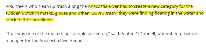 “Mink’s masks” (joking of course, she just helped set-up the crowd source for them) are probably the first or second most-polluted item now and the results are terrible for streams and rivers and the local environment. Excerpted from the Southern Maryland Chronicle, from an article about Chesapeake Bay micro-plastics in June, 2021: