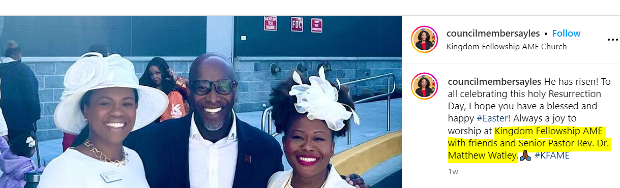Now, it appears the Kingdom Fellowship AME has another powerful connection on the Montgomery County Council in Councilmember Laurie-Anne Sayles, as evidenced by this Instagram post [screen shot is below]: