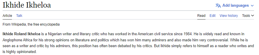 Mr. Ikheloa has his own Wikipedia page / entry and claims he is a prominent “literary critic” who has worked in the “American civil service since 1984.”