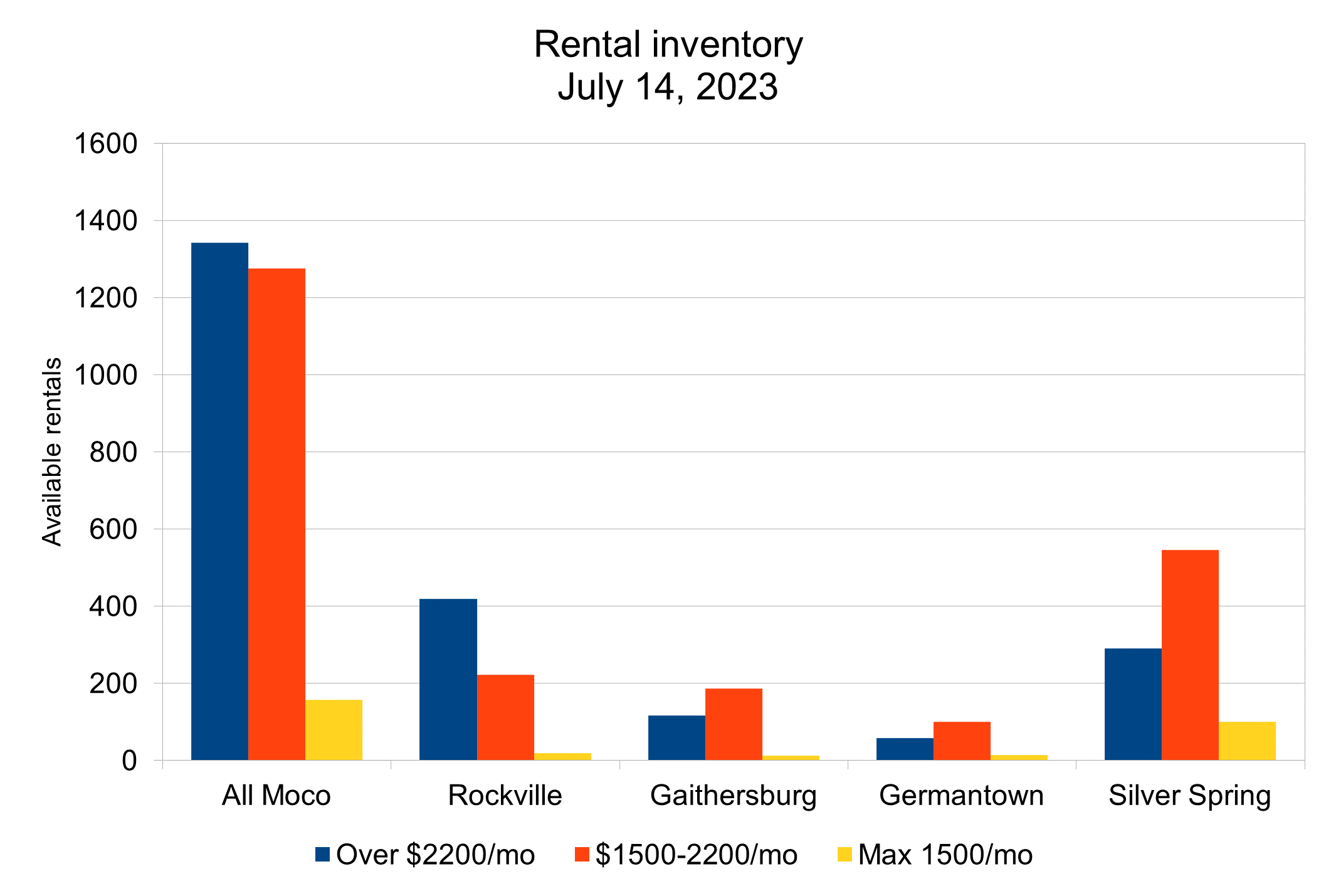 I’m starting a tabulation of the county’s rental stock as published on realtor.com. As of July 14, here were the number of units available for rent throughout MoCo.