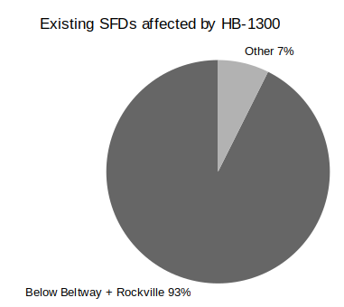 There are 62,098 SFDs built before 1959 out of 185,229 today, so just under one-third of the SFDs are affected by this legislation. Furthermore, over 90% of those pre-1959 SFDs are located below the Beltway and in Rockville.