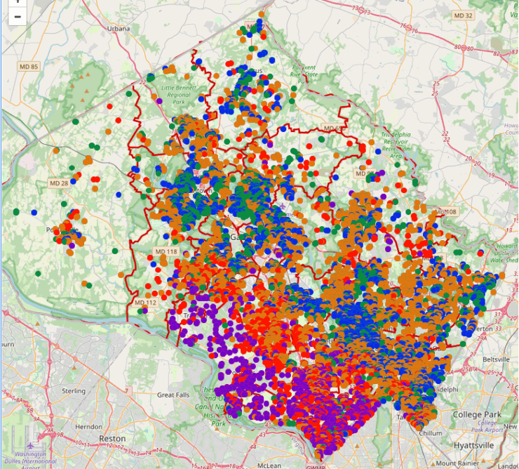 I’ve mentioned several times that MCPS is redlined based on affluence: affluent families live in areas where the schools are successful, and struggling families live in areas where the schools struggle along with them. In this post I present a visualization of this claim.