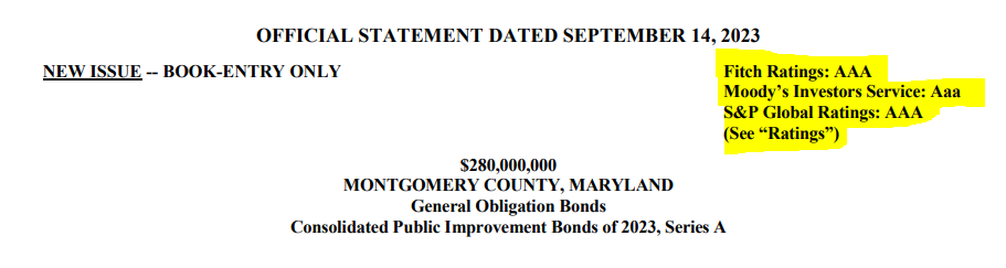 Montgomery County’s Department of Finance issued a routine statement in mid-September about County “General Obligation Bonds” the government is looking to sell to investors. MoCo is seeking to raise $280 million via selling debt to interested parties. Of course, off the bat the County loves to showcase its “Triple A” ratings via Wall Street firms like S&P and Fitch, on the prospective debt notes (page 1):