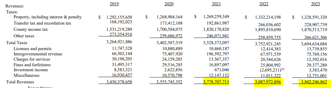 So, how do we know the over-spending is occurring and how do we know the MoCo economy isn’t booming or flush with new jobs? Because the MoCo government’s own numbers confirm it, courtesy of ‘Table 6’ on page 15 of their bond report as they seek to finance government via debt. Total taxes (i.e. the revenue base) are pretty stagnant despite all the taxes and fees that have been raised under Marc Elrich and the County Council in just the past year (although many were indeed just hiked and have yet to be reflected):
