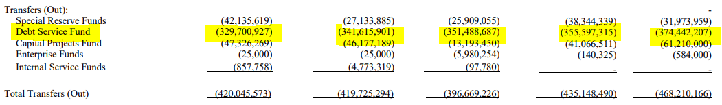 And, the ‘debt service fund’ in the “transfers out” section of this table shows steady growth. Year after year: