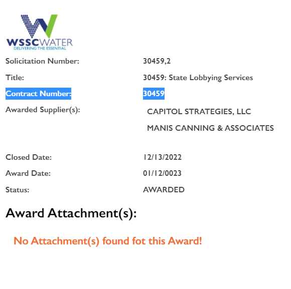 How much is WSSC paying Annapolis-based lobby firms, for example? Below is a capture of a recent solicitation and contract number direct from WSSC’s database.