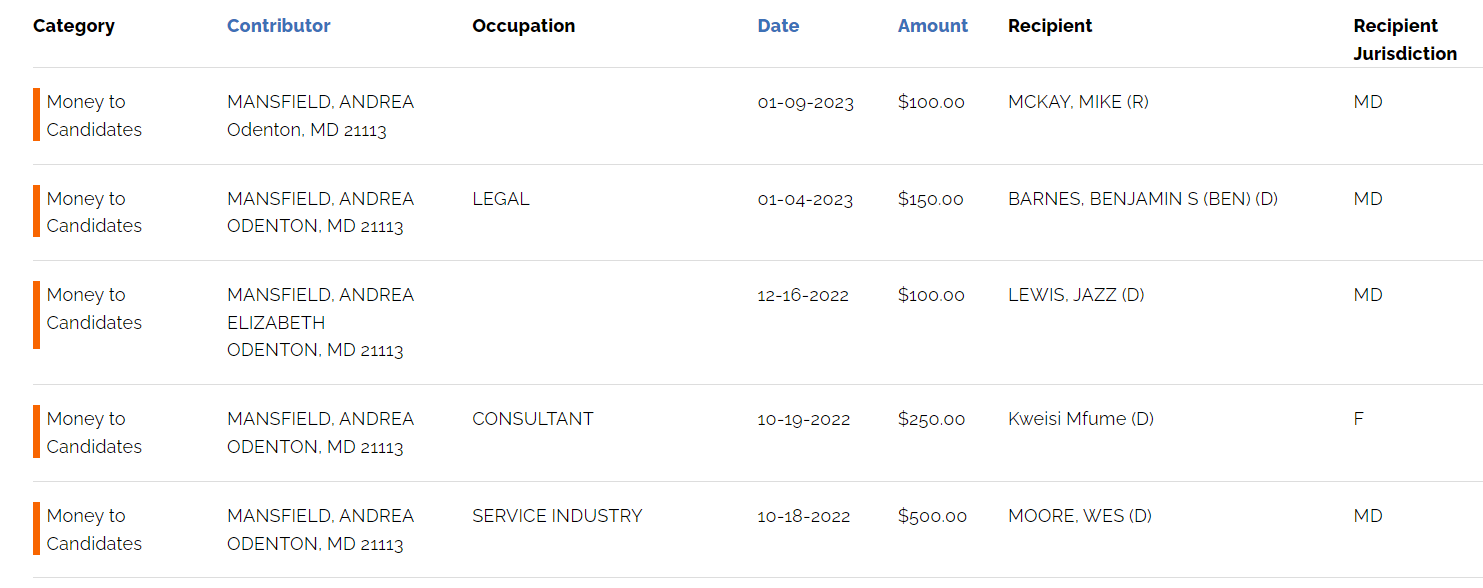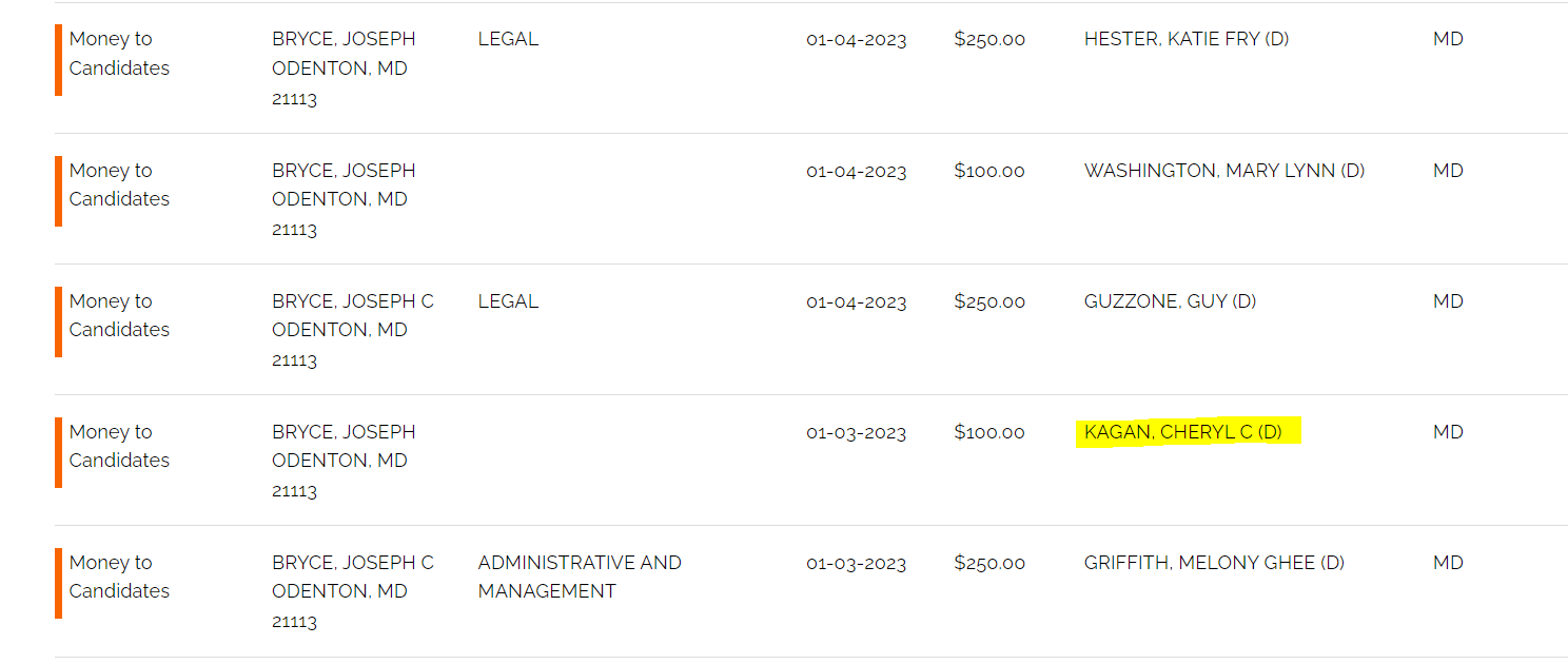 Another MC&A Esquire, Joseph Bryce. Let’s see who he has been donating to, as well. Oh look, another Maryland State Senator Cheryl Kagan spotting!