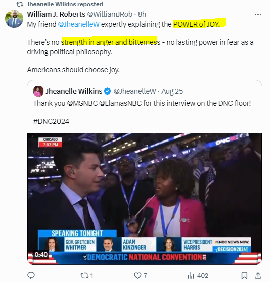 State delegate Jheanelle Wilkins kicks us off here, with her brief MSNBC spotlight during the convention / coronation, where she was able to talk about the “power of joy”: