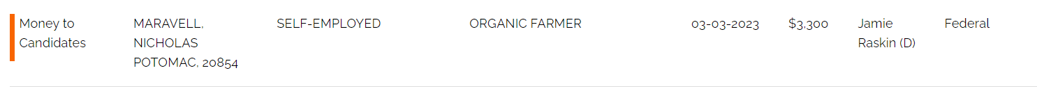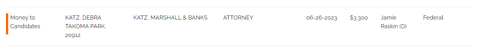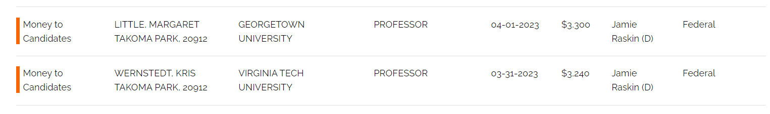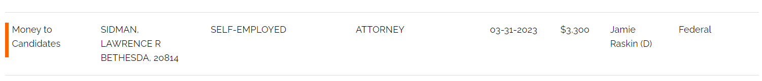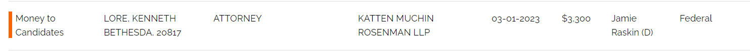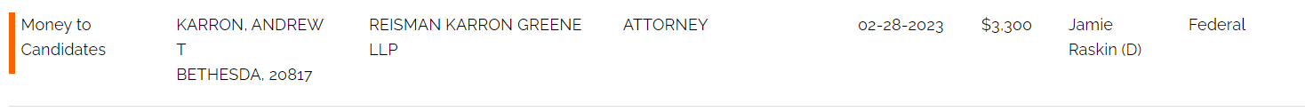 (Mr. Karron appears to be an adjunct professional lecturer at American University).  There are dozens of attorneys from out of the county and based in DC who have donated the max amount to Mr. Raskin as well.  The lawyer profession is well-represented with Mr. Raskin.