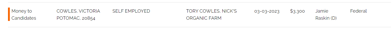 This would be Nick Maravell, owner of Nick’s Organic Farm in Potomac, MD.  The owner was involved in a lengthy, costly dispute with Montgomery County over ten years ago because the County wanted to move on from leasing prime public land (owned by the county public school system) to his farm.  Mr. Raskin was likely involved in resolving the dispute between the Potomac farm and County School Board officials.
