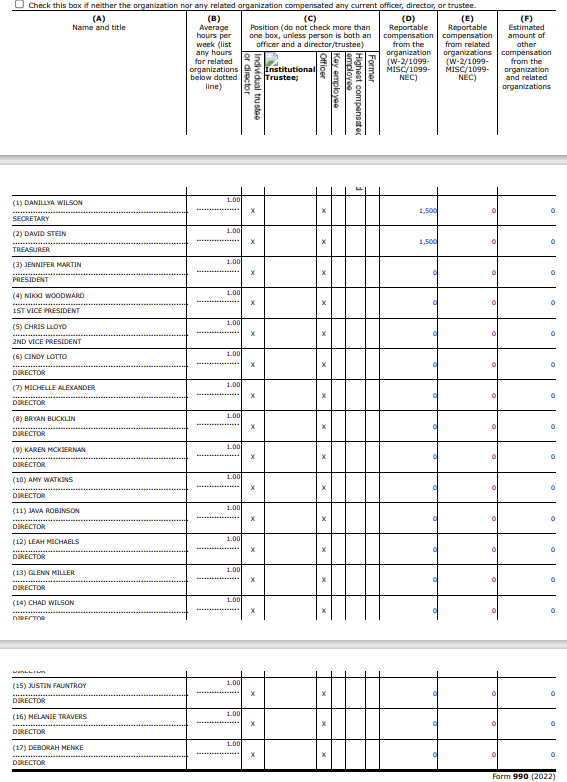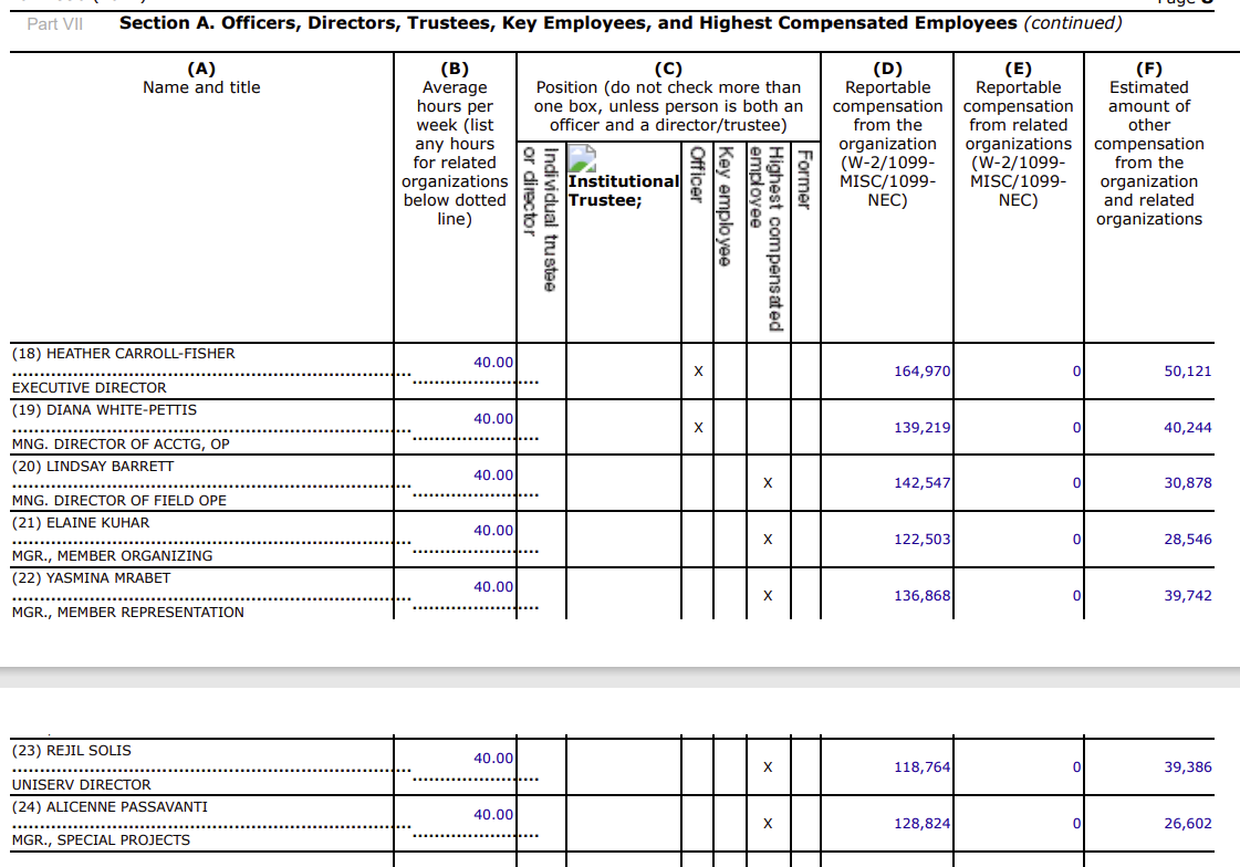 Part VII of the form 990 covers the Compensation of Officers, Directors, Trustees, Key Employees, Highest Compensated Employees, and Independent Contractors. Section A lists Officers, Directors, Trustees, Key Employees, and Highest Compensated Employees. In the filing MCEA starts with its Board of Directors. These are MCPS employees (current or retired). It is not clear if the employees still employed by MCPS also work 40-hour weeks for MCPS, but in the tax filing, MCEA reports that each board member only worked an average of 1 hour a week. Two of the board members received some sort of compensation, but the rest seems to be on a volunteer basis.