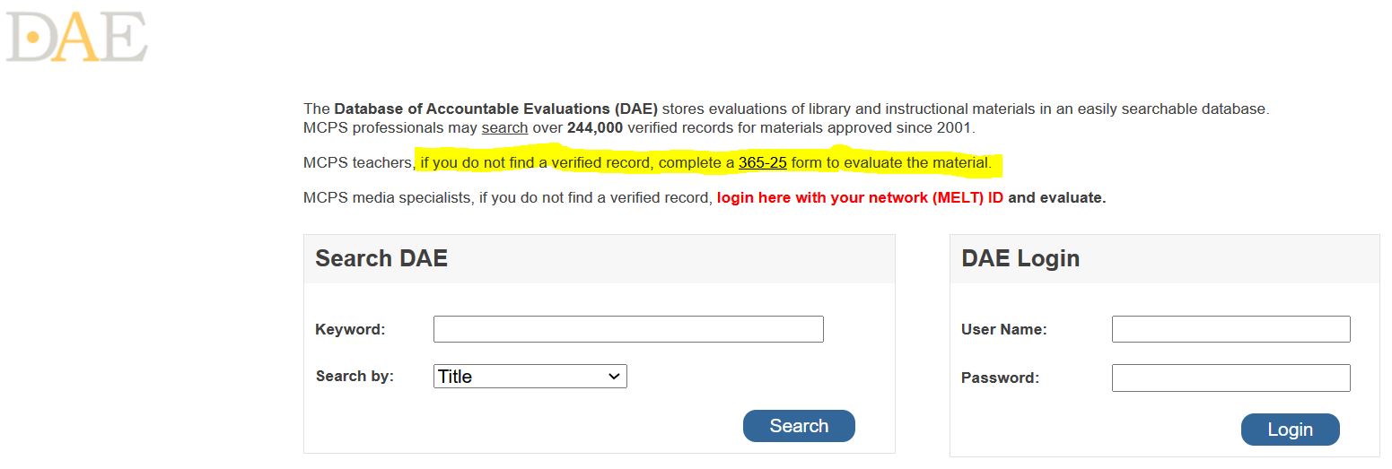 These records can be viewed utilizing MCPS’s Database of Accountable Evaluations (DEA), which stores evaluations of library and instructional materials in an online searchable database.