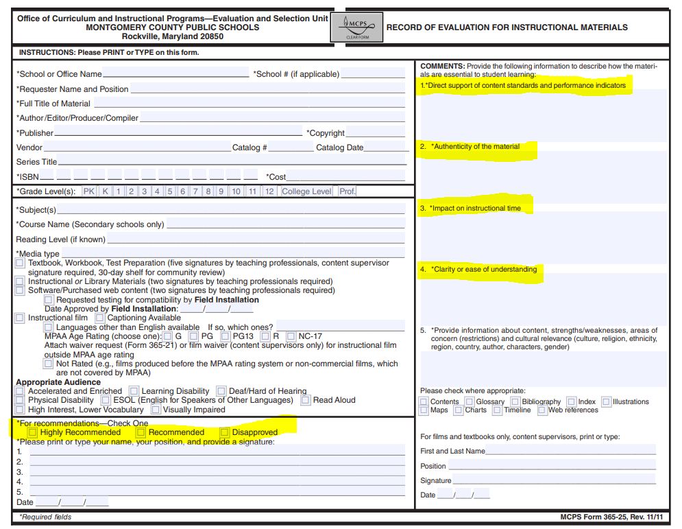So the question becomes: why does MCPS’s own regulation guiding the evaluation of instructional and library material not reflect this? In looking at the regulation it clearly states that a Form 365-25 should be used in the evaluation of library books (page 6).