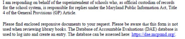 On November 21st, MCPS responded to the MPIA by providing the already publicly available DEA records for each of the three books. After receiving pushback that this did not fulfill the MPIA, MCPS provided a response on December 21st stating that all information requested by the MPIA was provided and that the DEA information is exactly the same as what is provided in Form 365-25. It also directed the submitter to resubmit an MPIA if they seek additional information. An additional MPIA was filed, requesting the Form 365-25 for each of the three books. MCPS provided a response that the Form 365-25 is not available because it is not used, and instead of using the form, entries are made directly into the DEA database.