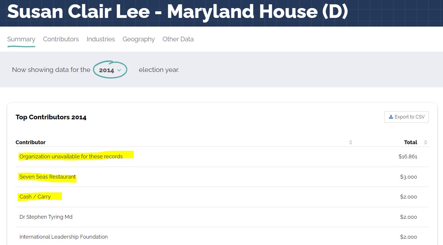 In 2014, Lee ran for the Maryland state senate. Per campaign financial reports available at OpenSecrets.org, Lee received a lot of interesting donations – including some labeled “cash / carry”. Over $16,000 shows up as being “unavailable” for OpenSecrets.org’s records. Screen shot is below, after filtering to 2014: