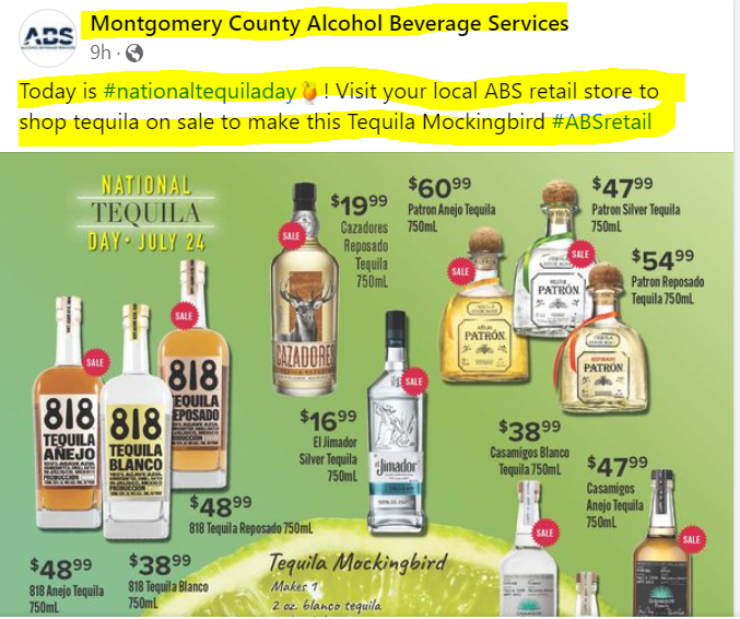 Buy buy buy our Tequila! Get it cheaper in MoCo! Support your local County government monopoly.