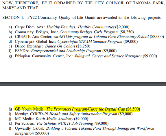The non-profit also got “advancement grants” in 2020 and an operating grant later on. It also appears to have squeezed some money from the City of Takoma Park, MD recently, per a document outlining ‘FY22 Community Quality of Life Grants’ (see below). And actually, that is fine – the City of Takoma Park is specifically where this non-profit outfit should be getting its funding, not the population of MoCo at-large, as we shall see later.