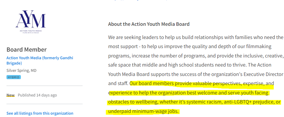 Even the description provided recently at idealist.org for a new ‘Board Member’ to Action Youth Media sounds like an audition for a Democrat party-aligned activist 501c4 issue-advocacy organization, or maybe even a 527 PAC… not a 501c3 public charity. And also… underpaid minimum wage jobs? Where? In Montgomery County? The minimum wage is being hiked yet again on July 1, this time to $14.50 for even the tiniest of businesses or start-ups with barely any employees. The youths will sure need it to afford the state gas tax hike to over 47-cents per gallon the same day.