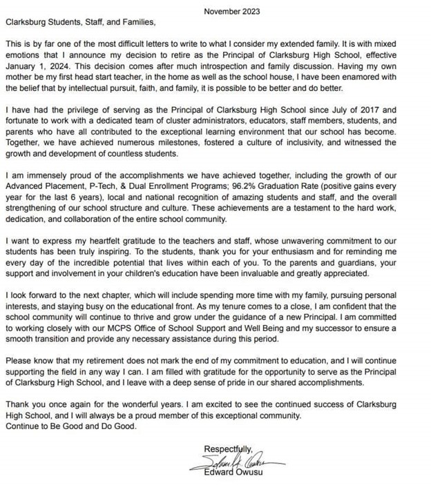 Students at Clarksburg High School were chanting anti-Semitic slogans earlier this month. The outrage was immediate, and the principal who apparently approved the demonstrations, Edward Owusu, announced his retirement a few days later. Although he cited the end of his career, the timing of his retirement proves that he could not excuse, rationalize, or justify his behavior or that of his students. He couldn’t bring himself to apologize, but at least his pension is secure.