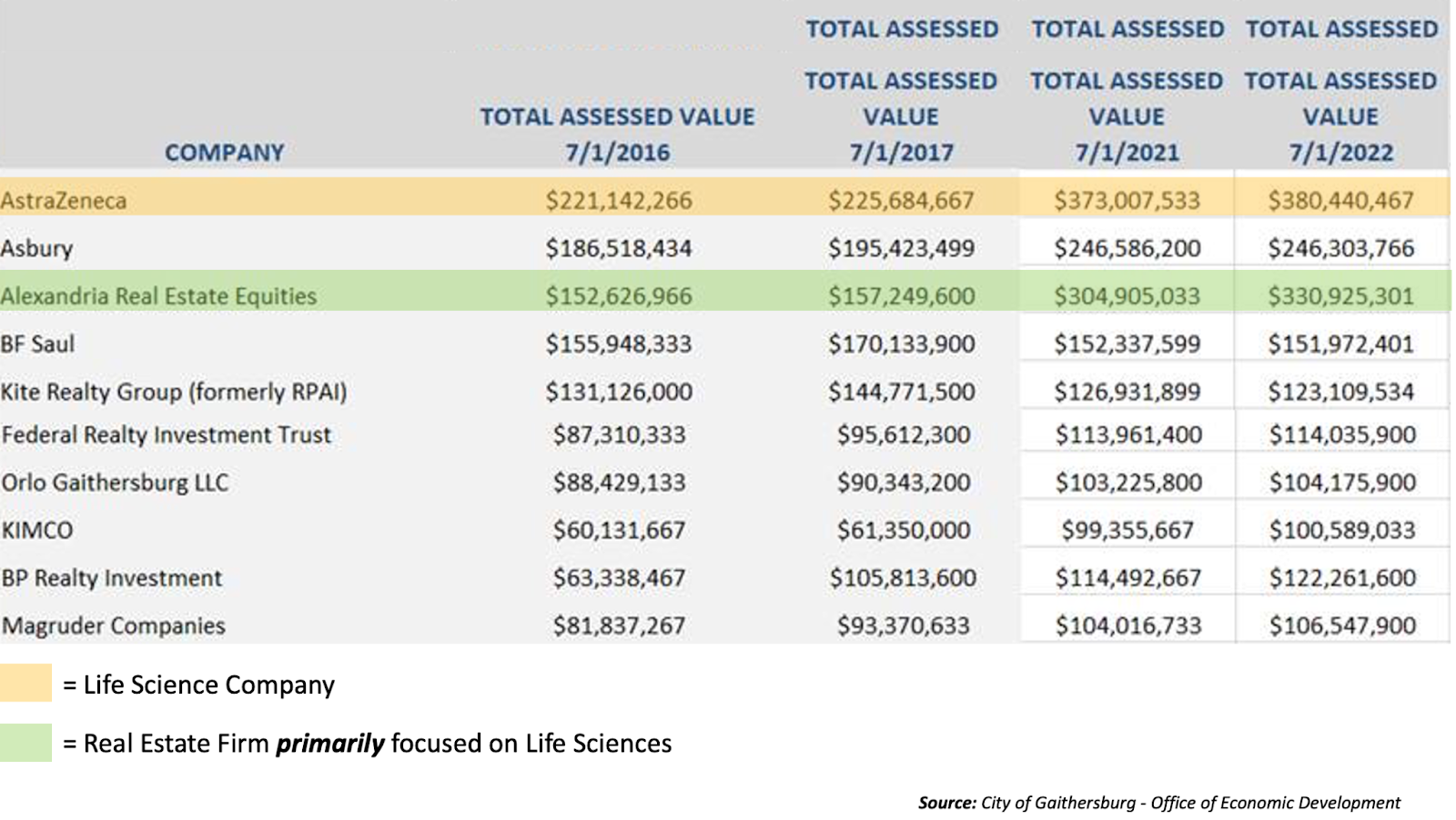 • Strong Tax Base – Our largest property taxpayers are in the Life Sciences. Either directly like Astra Zeneca or indirectly through Real Estate Firms that specialize in the Life Sciences (e.g., Alexandria Realty). Here is a snapshot of data in the city of Gaithersburg. The impact is even greater when you consider the rest of MoCo.