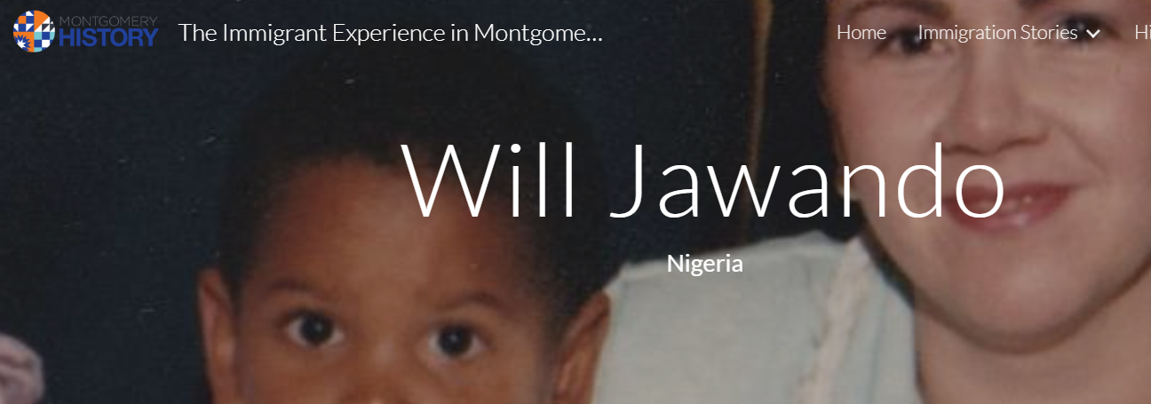Featured prominently under “Immigration Stories” are parts one and two about CM Jawando’s familial history and how his mother ended up coming to Montgomery County to raise young Will Jawando. A screen shot excerpt is below (relevant parts highlighted) detailing such history noted in this “digital exhibit”: