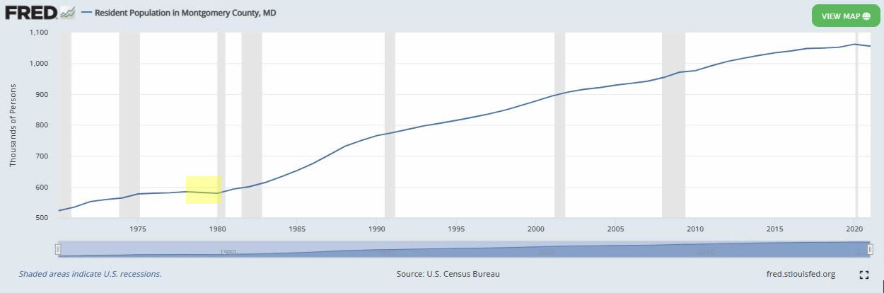 This is fascinating. Until the year 2021, it had been 40 years since Montgomery County had experienced a decline in population. From 79-80 there was a dip in population, but otherwise all data for Montgomery County shows a year over year increase. Until 2020-2021. Could this be the result of COVID deaths? Maybe. But it could also be the start of a more serious migration of the resident population out of Montgomery County. The net county-to-county migration trend in Montgomery County has not been positive since 2010.