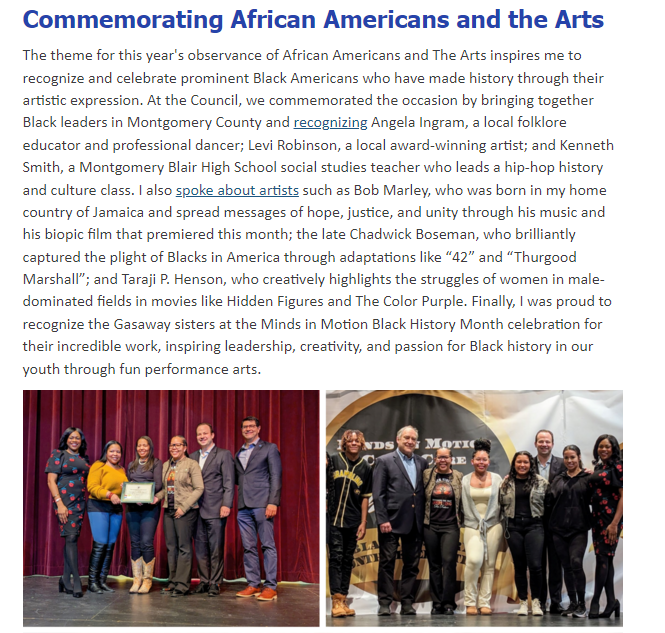 Go ahead and watch the clip below (on the official MoCo, MD YouTube Channel) featuring CM Laurie-Anne Sayles giving us a one minute, 33 second “insight on the significance of Black Americans and their profound influence on various aspects of our society.” Word salad, much?