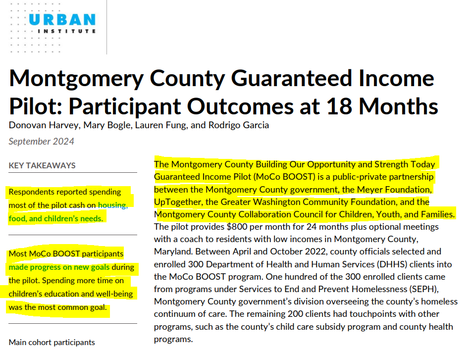 We finally have something of a detailed evaluation, by a left-leaning think tank called the Urban Institute, of MoCo’s “Boost” Guaranteed Income Pilot program. Recall that MoCo’s “Boost” Guaranteed Income Pilot is a so-called “Universal Basic Income” (UBI) pilot program rushed into existence by the County Council back in 2021. The County was flush with federal government Covid recovery cash and wanted to try something that had already been attempted as public policy, reviewed, and evaluated by dozens of cities and towns across the globe. It is a supposed “public-private” partnership which mixes taxpayer funds (about $1.2 million was allocated initially) with matching private donation money.