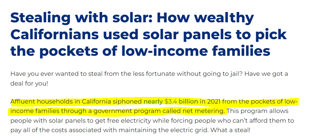Now though, new research and energy policy changes out of Maryland’s progressive “big brother” state of California, the go-to for 90% of MoCo’s (and Maryland’s) bad public policy ideas, is throwing cold, cold water on the “green” reverse Robinhood energy policy of taking money from the poor to hand to the rich, such as solar-panel pusher Mr. Elrich. Looks like the Takoma Park tyrant’s “green utopia” is really just redistribution – but from the poor to the already wealthy!