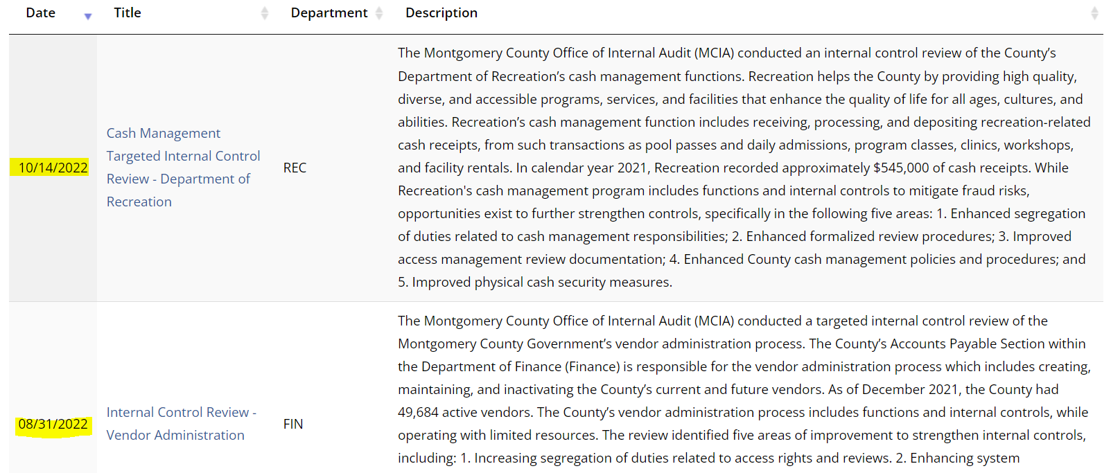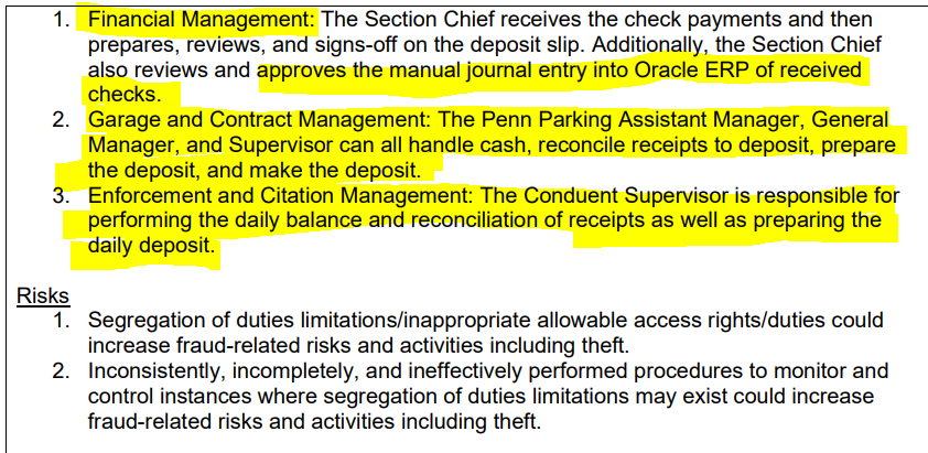 Interestingly, diving briefly into both the October 2022 report on the cash management at the Department of Recreation and the August 2022 report on the cash management practices and controls at the MoCo Department of Transportation, a similar theme arises. Montgomery County departments have very lax segregation of responsibilities when it comes to cash handling, recording that cash and then reconciling the records to a bank statement. This is a common cash issue for a small business, which generally only has two or three employees with which to carry out some of these functions.