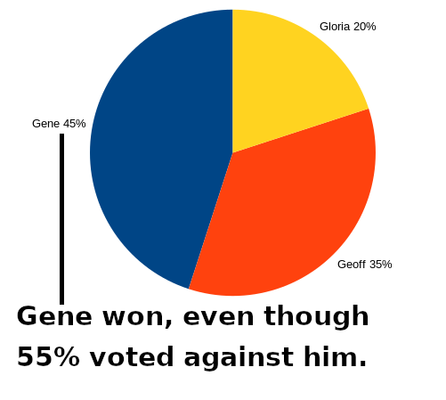 The “winner” of our local primary elections is the one who accumulates the most votes, not a majority of votes. For example, Gene, Geoff and Gloria run for office. On election night, Gene wins 45% of the vote, Geoff 35%, and Gloria 20%, so Gene is the winner—even though more people voted against him than for him.